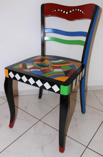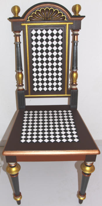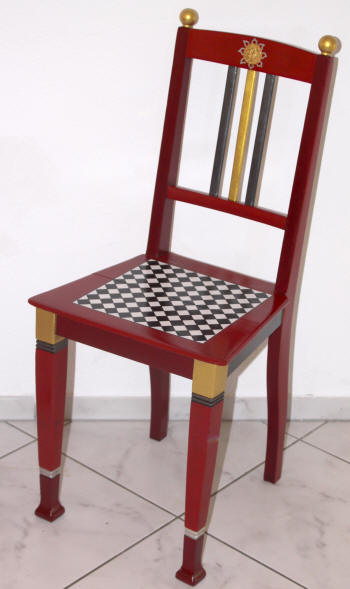 | Stuhl, schwarz weiss gold | Stuhl rot, mit Rauten |